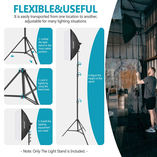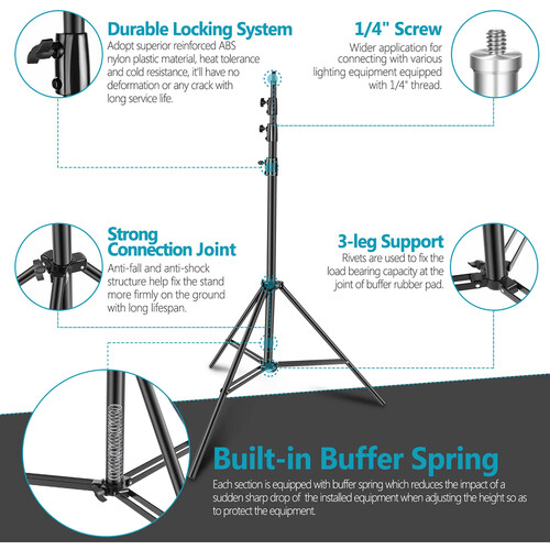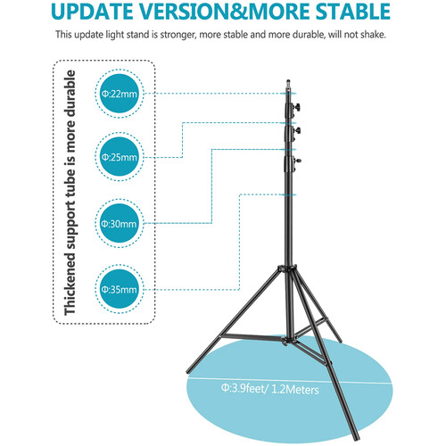 The black, aluminum Heavy-Duty Light Stand is a 13′ support that can handle gear weighing up to 22 lb. The 3-section stand has a minimum height of 4.5′ and is topped with a 5/8″ stud with 1/4″-20 male threads.