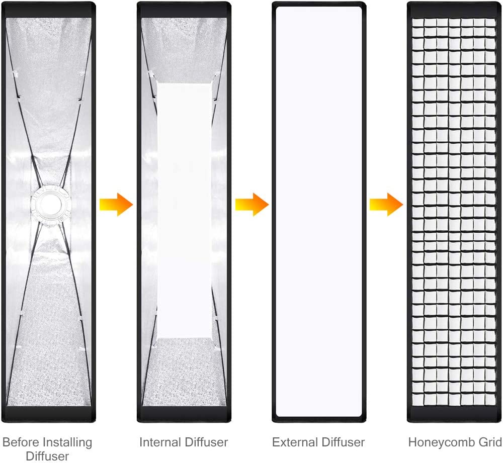 - Softbox equipped with grids to control light spill and tighten the total coverage area.