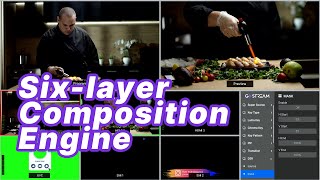 Using the Super Source feature, merge two video windows and one background video into a unified single source. The source then becomes a standard video input integrated into the composition engine. Select source material from video inputs or internally generated still image signals. Modify the layout, size, position, and border of each window.