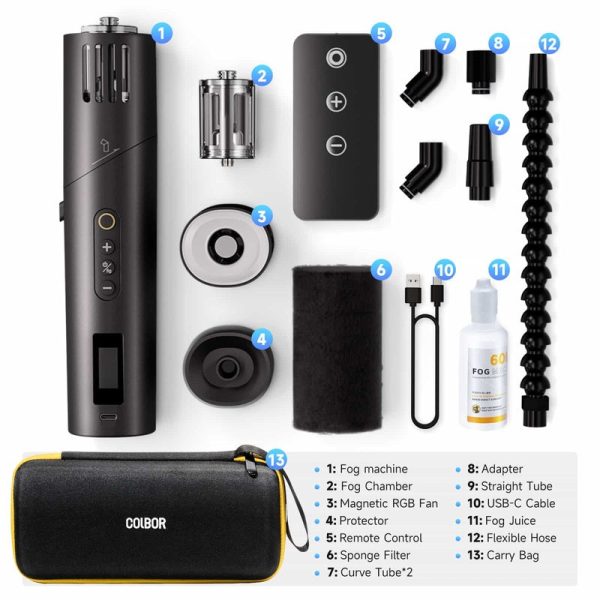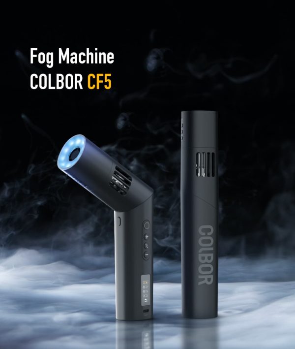 The CineFlare CF5 from COLBOR is a reliable and effective fog smoke machine, designed for precise smoke direction. Its tilted gun-inspired build allows for comfortable handling, enabling users to precisely direct the flow during various applications, particularly low-angle smoke effects. The CF5’s adaptable body provides access to interchangeable accessories such as an adjustable magnetic RGB light and fan, a flexible hose, and a nozzle cover. When in “Master Mode,” the smoke machine offers various settings and modes that introduce new possibilities during the creative process.