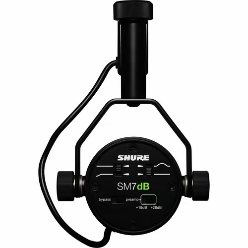 The SM7dB features a cardioid polar pattern, bass roll-off, and midrange emphasis (presence boost) controls as well as shielding against broadband interference. An internal air suspension shock isolation helps to eliminate mechanical noise transmission, and a yoke mount facilitates mounting and provides precise control of the mic position.