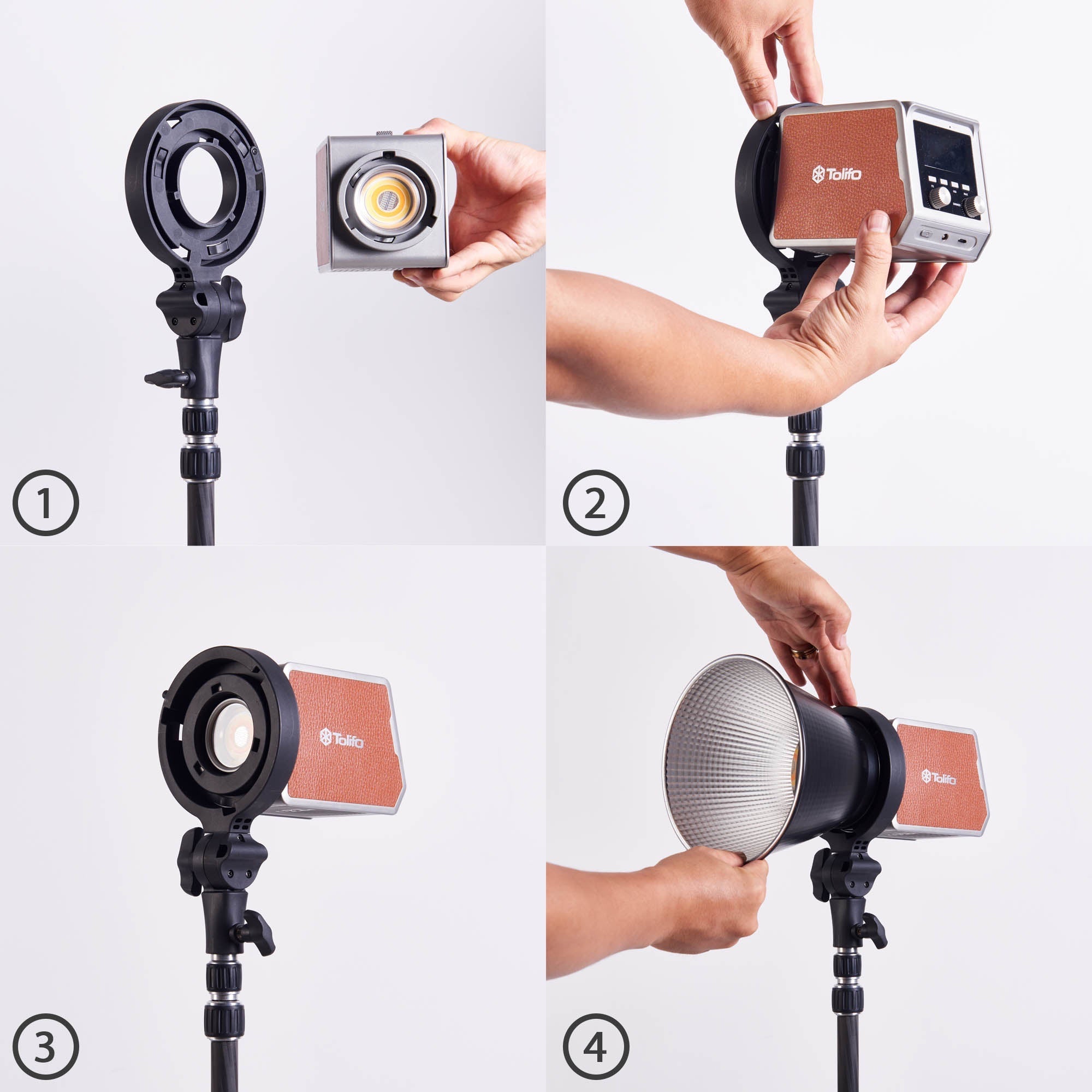 It can be connected to the front of PL Series Light and mounted on a light stand.