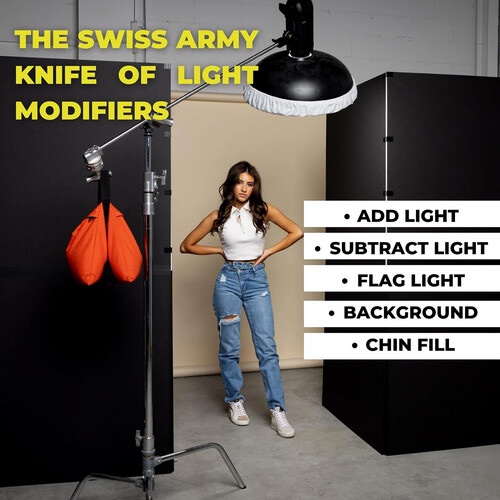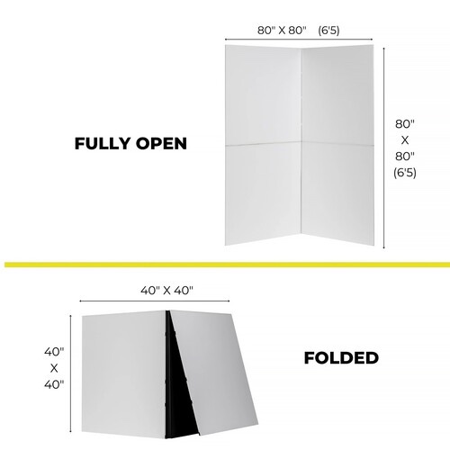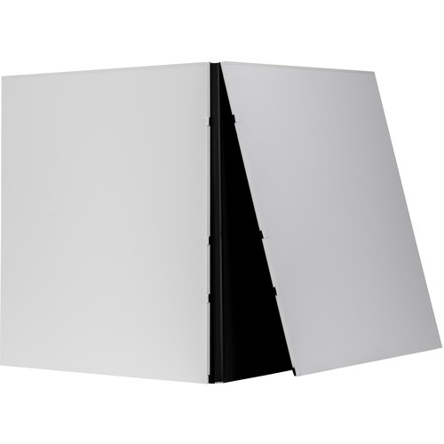 Lightweight and easy to transport, the Foldable Black/White V-Flat from V-Flat World is a fresh take on the venerable flat. The V-Flat is white on one side to reflect, and black on the opposite side to block light. Each board is 40.0 x 80.0 x 0.5″. Opened fully yields an 80.0 x 80.0″ surface. And for travel, the 7.0 lb V-Flat folds to a compact 40.0 x 40.0 x 2.0″. The hinged design offers a variety of useful positions.